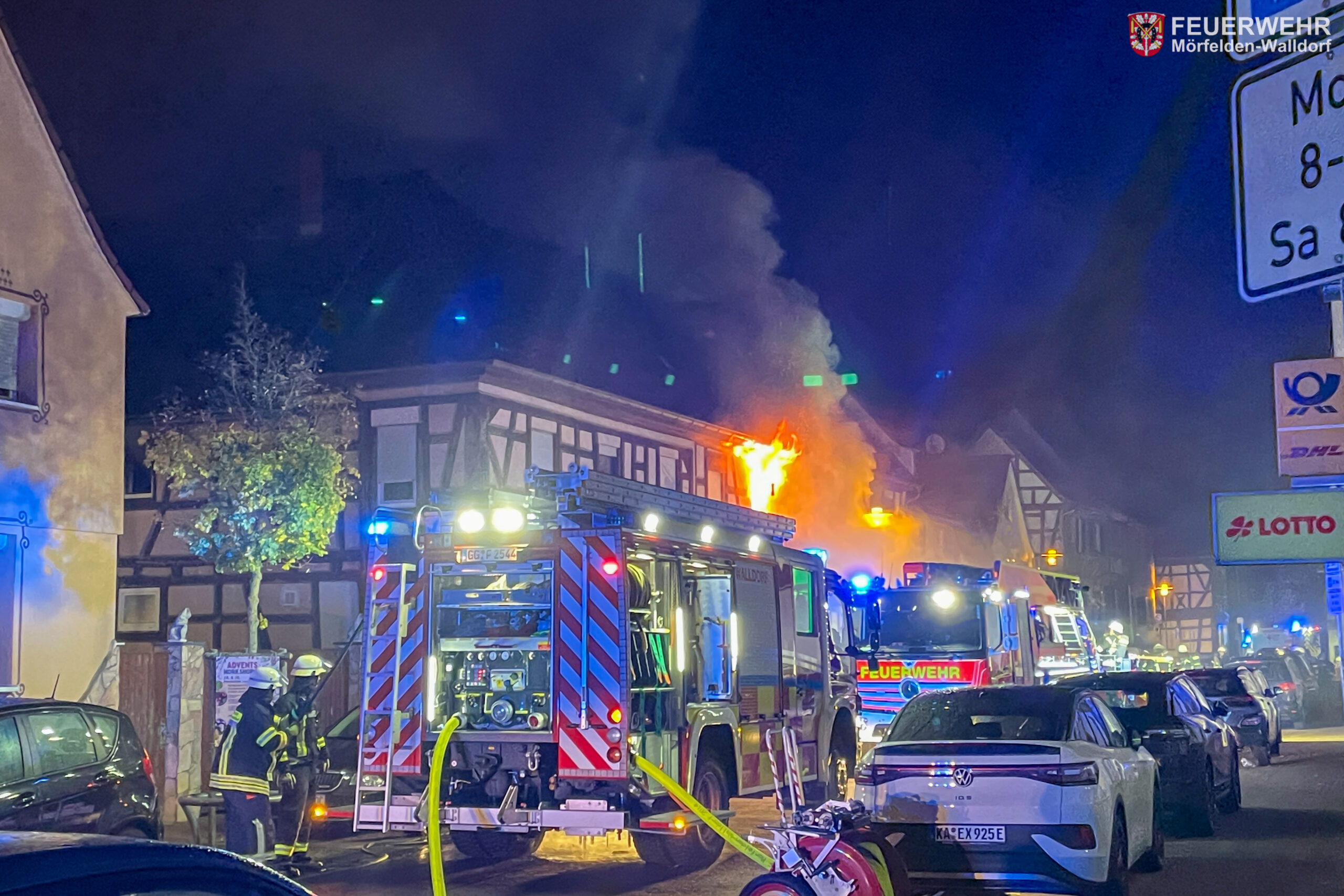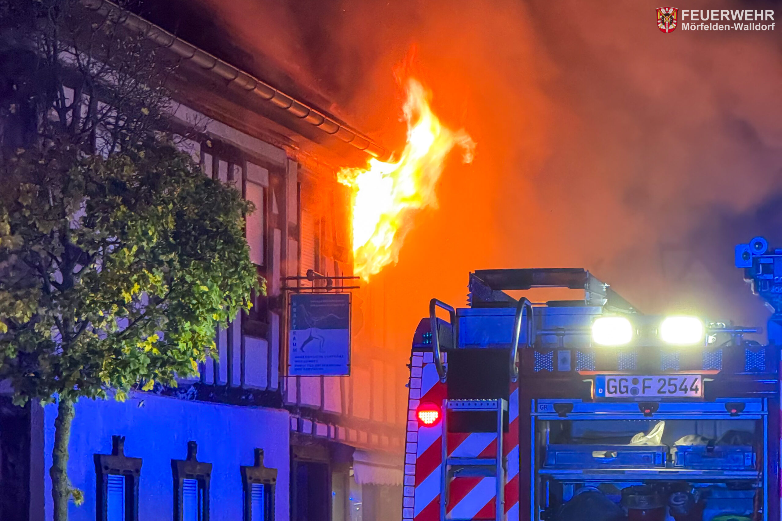 Somit konnten sich die Einsatzkräfte auf die Brandbekämpfung konzentrieren und ein Trupp unter Atemschutz ging umgehend vor, um das Feuer zu löschen. Der Brand hatte sich rasant ausgebreitet, sodass schon im Flur den Feuerwehrleuten Flammen entgegenschlugen und ein weiteres Vorgehen aufgrund der enormen Hitze nicht möglich war. Kurze Zeit später kam es zu einer Rauchgasdurchzündung, welche einen Rückzug erforderlich machte. Nachdem der Brand mit zwei Strahlrohren im Außenangriff und über die Drehleiter eingedämmt wurde, konnte der Innenangriff fortgesetzt werden. Da weitere Atemschutzgeräteträger benötigt wurden und sich der Brand auf Teile des Dachs ausgebreitet hatte, wurde zur Unterstützung ein weiterer Löschzug von den Feuerwehren aus Groß-Gerau und Büttelborn angefordert. Gemeinsam mit den Kameraden gelang es den Brand einzudämmen, sodass um 04:35 Uhr Feuer aus gemeldet werden konnte.